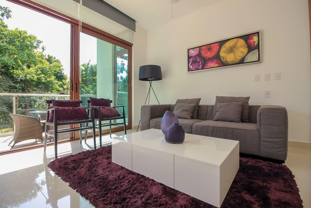 Comodidad en el área de sala, comedor, cuarto de TV y una terraza privada con vista directa al Campo de Golf PGA, distinguido como el mejor de México en 2024.